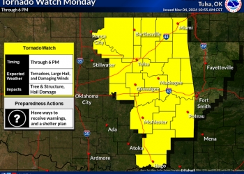 A Tornado Watch is in effect until 6 p.m. Monday evening across eastern Oklahoma.
