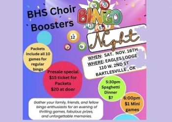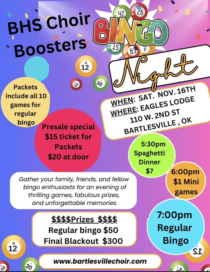 To support the Fine Arts Department’s programs, the Bartlesville High School Choir Boosters will host a Bingo Night on November 16 at the Eagles Lodge in downtown Bartlesville. This fundraising event will benefit both the choir and theater programs, particularly as they prepare for the spring musical, Les Misérables.