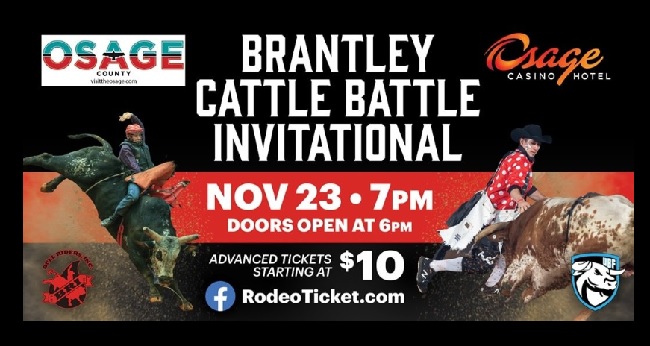 The inaugural Brantley Cattle Battle Invitational, presented by Osage Nation Casinos, is set to bring top-tier rodeo action to the Brantley Arena on Saturday, November 23rd at 7 p.m.