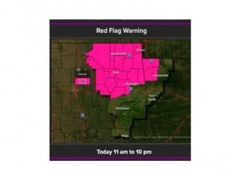 A Red Flag Warning remains in effect from 11 AM to 10 PM today for the area at greatest risk. Elevated fire weather concerns will extend across the rest of eastern Oklahoma and into northwest and west-central Arkansas, increasing the potential for new fires and exacerbating any ongoing fires.