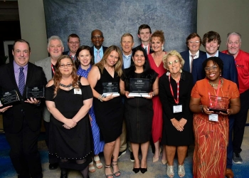 The staff of KWON after receiving the Best of Show Award from the Oklahoma Association of Broadcasters on Thursday Evening at River Spirit Resort in Tulsa.