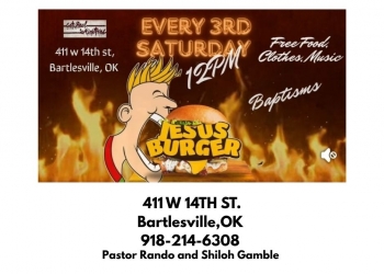 Jesus Burger events are held every 3rd Saturday at noon at Get Real Ministries at 411 W 14th St. in Bartlesville with the Word of God, burgers fresh off the grill, showers, clothes at no charge and baptisms.