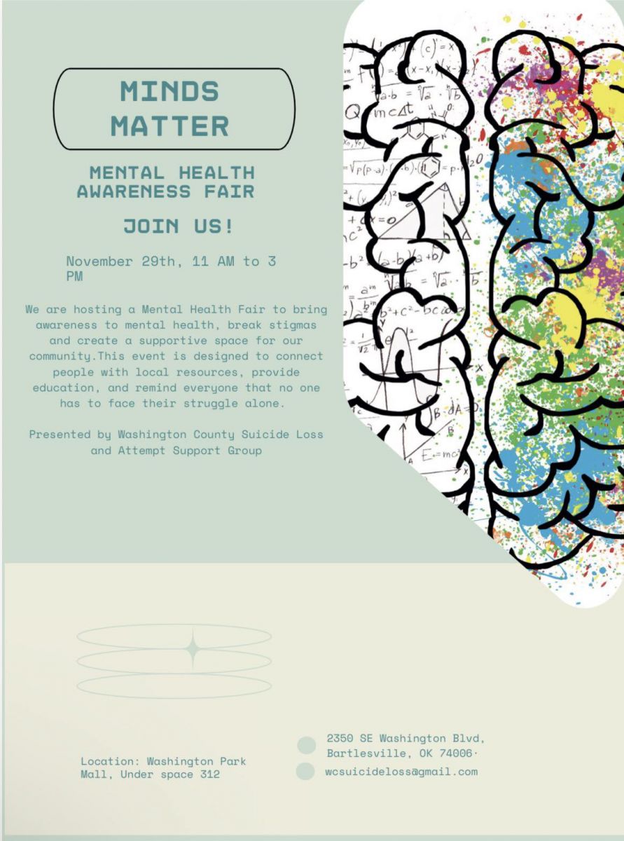 Mark your calendars November 29th at the Washington Park Mall 11am-3pm in Space 332 as The Washington County Suicide Loss & Attempt Support Group presents a free Minds Matter Mental Health Fair.