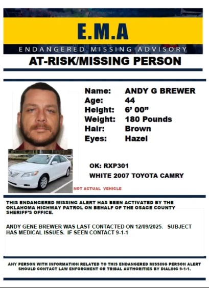 The Oklahoma Highway Patrol has issued an Endangered Missing Advisory for 44-year-old Andy G. Brewer. Troopers say he was driving a white 2007 Toyota Camry when he went missing.