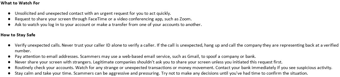 Director of Integrated Account Protection at Arvest Bank Erin Gray said, “Scammers are always finding new ways to steal money from their victims, and that includes using video calls to gain access to financial accounts… One of the best ways to keep yourself safe from potential fraudsters is to pay attention to red flags. When in doubt, contact your financial institution directly for assistance. At Arvest, we will never ask for a video call or request that you share your screen with us.”