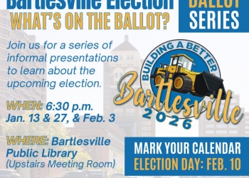 City staff will hold evening meetings on Jan. 13, Jan. 27, and Feb. 3 at the Bartlesville Public Library. Each session will begin at 6:30 p.m. in Meeting Room A on the second floor of the library, 600 S. Johnstone Ave.