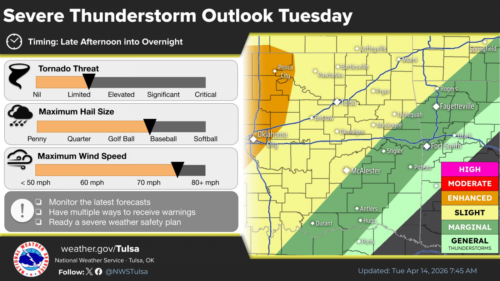 Late afternoon and evening time frames are most favored for severe weather on Tuesday. Current data indicate the severe weather threat will end west of a line from Vinita to Henryetta by midnight Tuesday night. The time frame for severe weather in the listening area is as early as 4 p.m., where the most likely time frame is between 6 p.m. at 10 p.m.